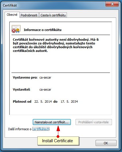 - Po úspešnom importe certifikátu znovu dvojklikom otvoríme ca-secar.crt a skontrolujeme, že import prebehol v poriadku